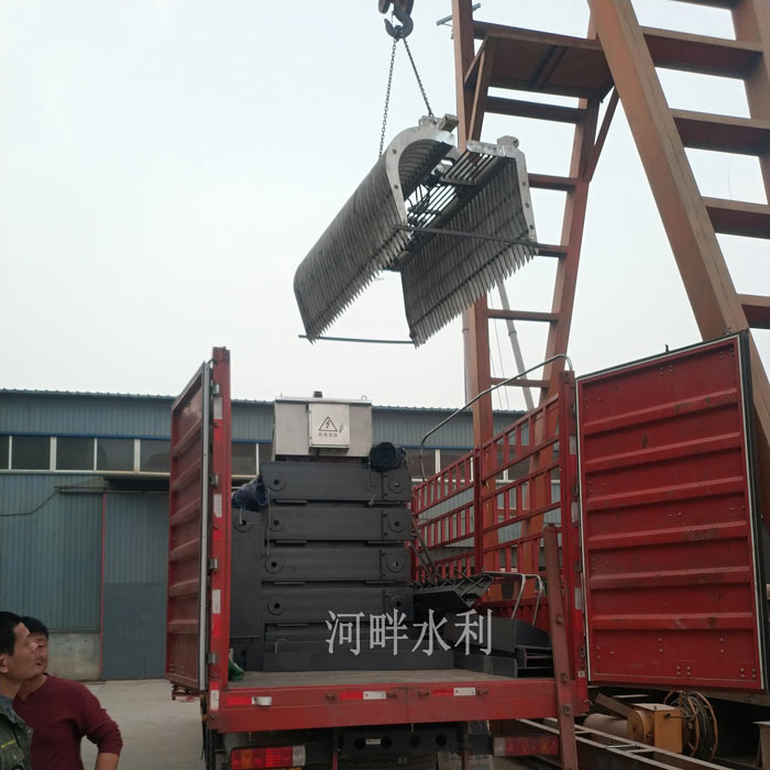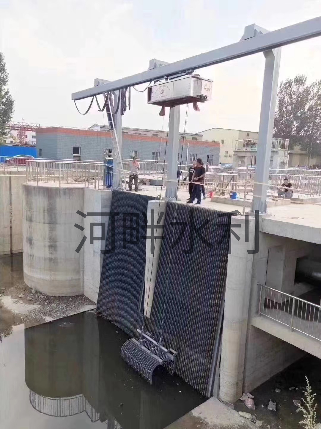 工作原理為:除污時(shí),通過(guò)行程開(kāi)關(guān)控制,使機(jī)架移動(dòng)到需清污的格柵位置,當(dāng)上下機(jī)架對(duì)位準(zhǔn)確后,耙斗才可順利下放除污。對(duì)于寬幅格柵,除污機(jī)除污完畢移動(dòng)一個(gè)齒耙有效寬度,繼續(xù)除污,直至格柵柵面污物清除完畢,柵前后水位差達(dá)到正常值時(shí)為止。對(duì)于多溝渠分布格柵,除污機(jī)除污完一個(gè)溝渠的格柵后,移動(dòng)至另一溝渠,繼續(xù)除污,直至所有溝渠格柵柵面污物清除完畢,柵前后水位差達(dá)到正常值時(shí)為止。